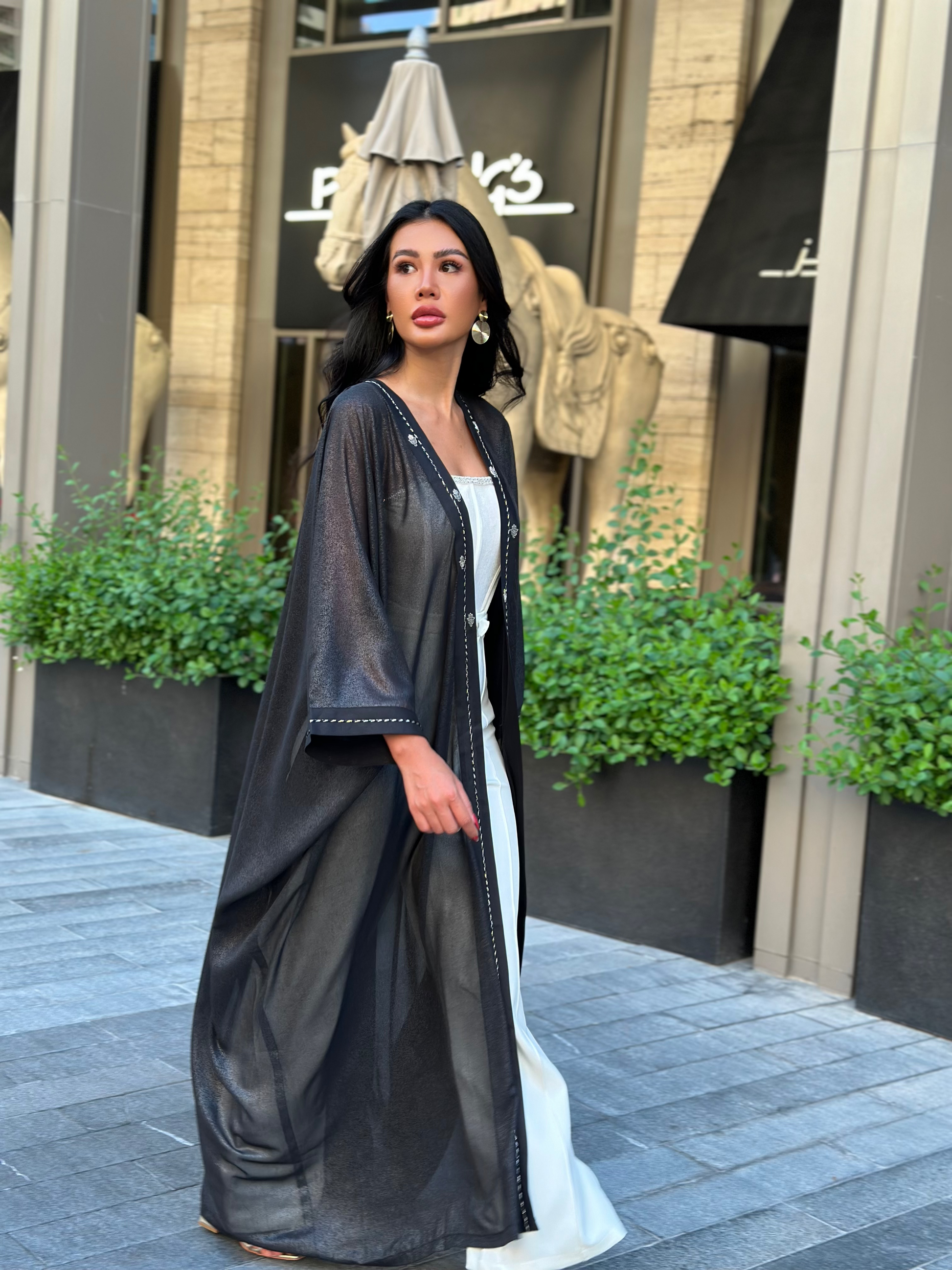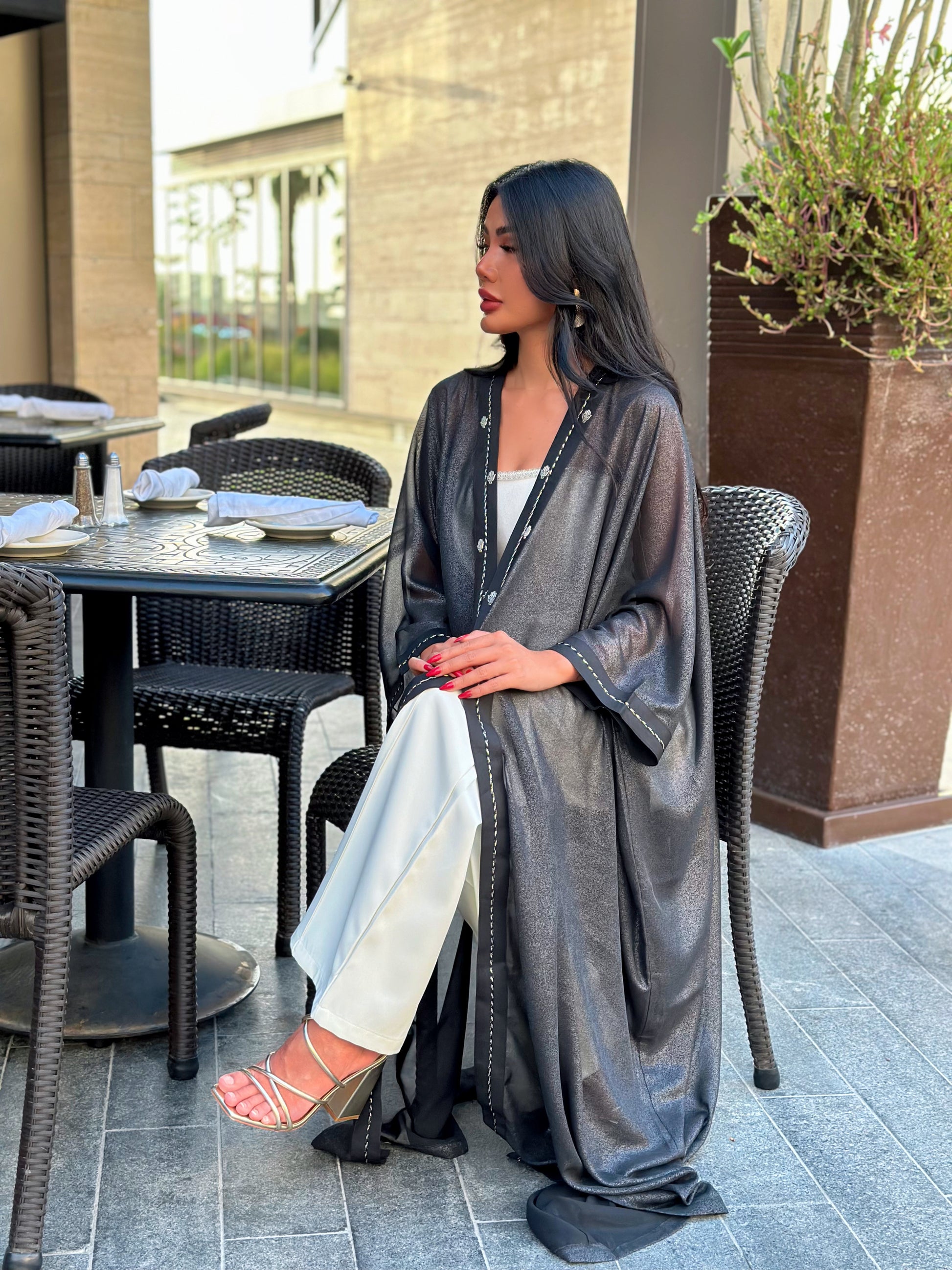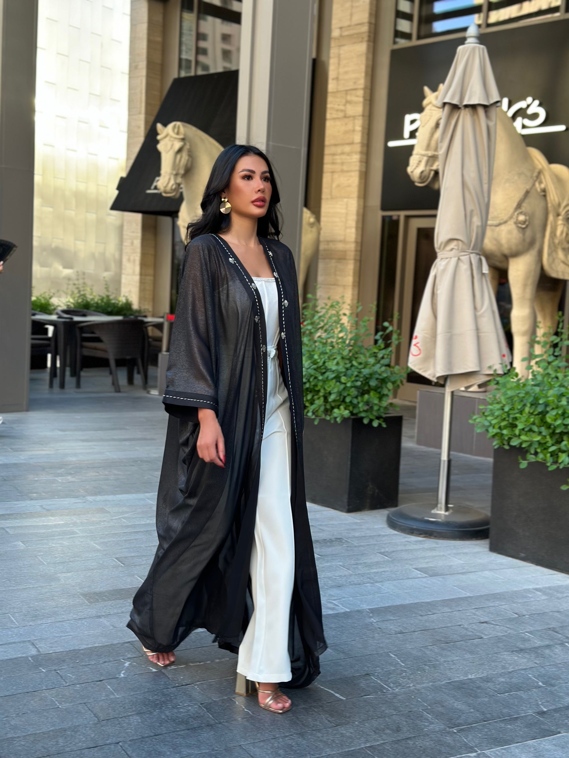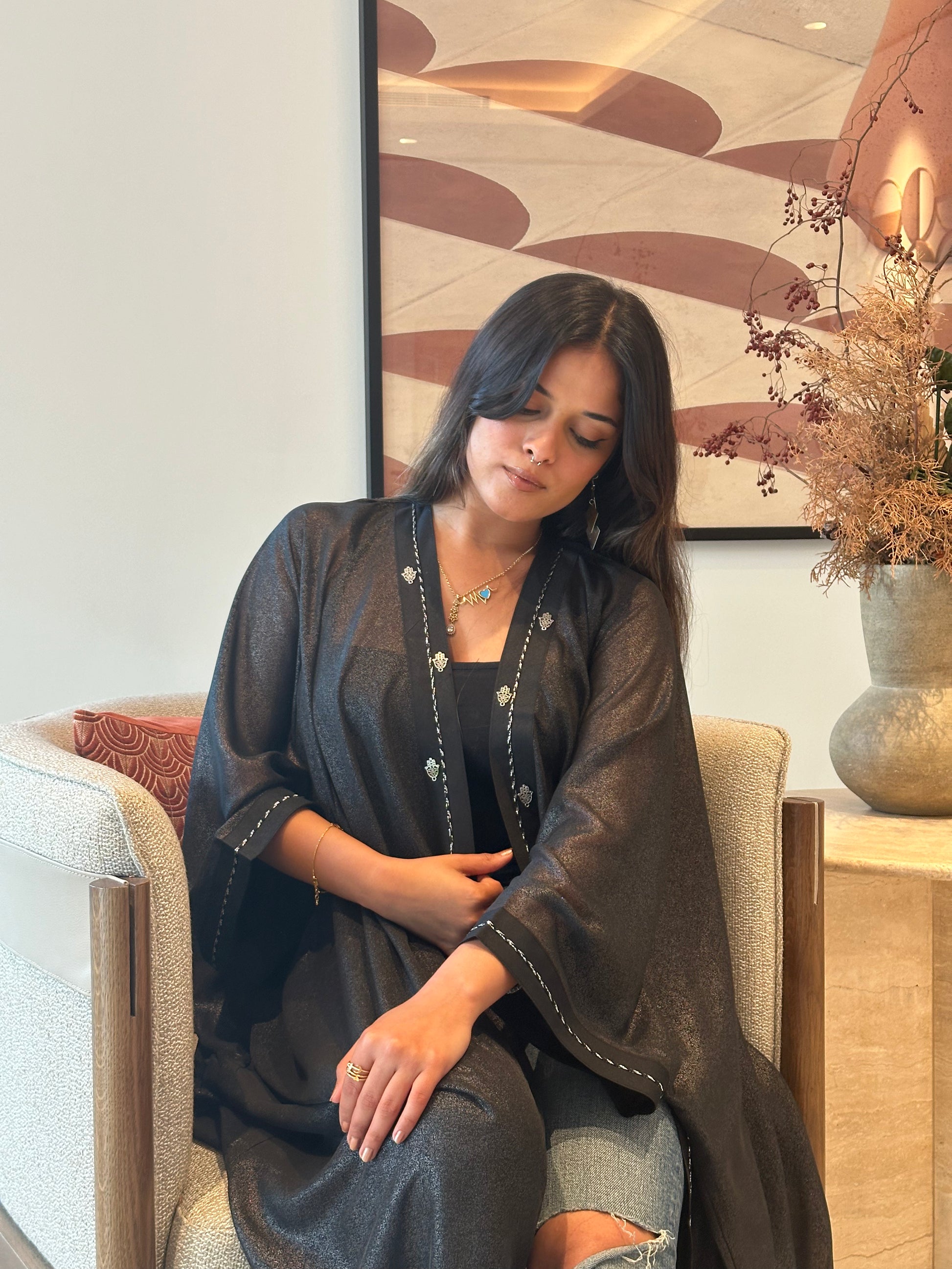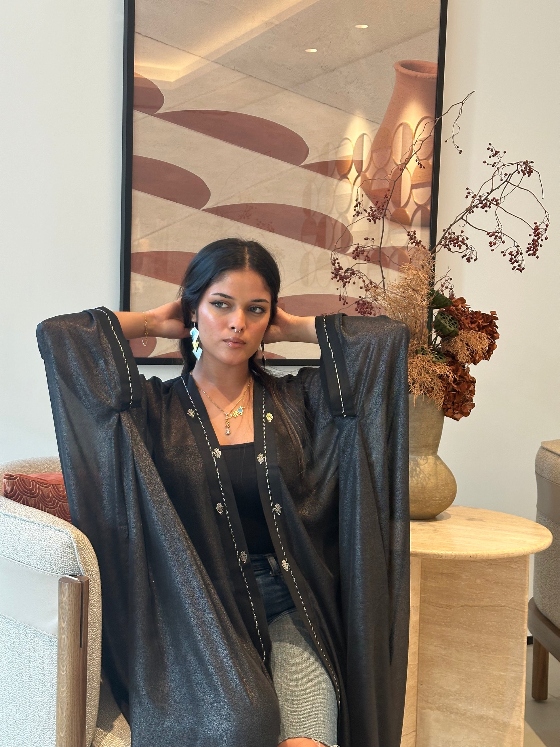 كيمونو أسود ذهبي من قماش الشيفون مع ضفيرة زخرفية في الأمام والأكمام وزخرفة خمسة في الأمام